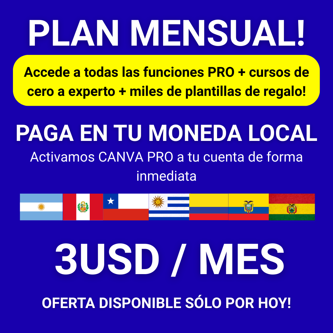 Incluye acceso a todas las funciones PRO de Canva: plantillas premium, imágenes, videos, música, fondos, eliminación de fondo, redimensionamiento mágico, almacenamiento en la nube y más.